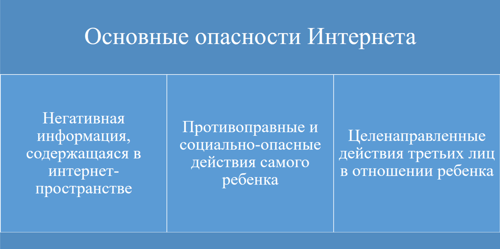 В Интернете содержится огромный массив информации, некоторая часть которой может нанести вред здоровью, а также физическому, психическому, духовному и нравственному развитию. Интернет является зоной «трудовой» деятельности мошенников, здесь действуют педофилы, кибербуллеры, сектанты и иные злоумышленники, которые находят детей в сети, а затем под различными предлогами вступают с ними в переписку и личный контакт.